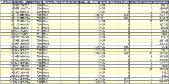 -Données d'activité par SéjourxUM (Effectifs proratisés, Effectifs non proratisés, Journées-Séances, Recettes T2A MCO par nature (Normaux-EXH-EXB-UM Spécialisés-Dialyse-Radiothérapie-Prélèvement d'Organe...) comme Recettes T2A MCO par tiers payant (TM-FJ-Assurance-Maj parcours de soin-AMO-AMC..), Médicaments-Prothèses-Actes Thérapeutiques&Soignants-Recettes Consultation par nature (Codes regroupement CCAM-NGAP-ATU-PO...)